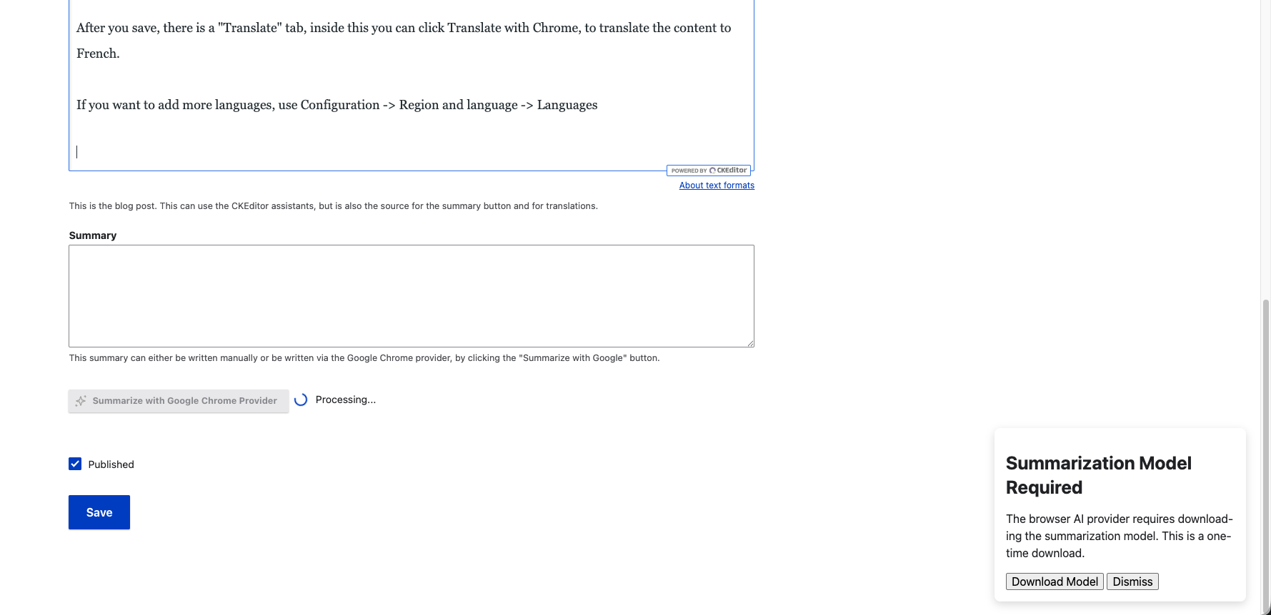 In the Summary field you have the "Summarize with Google Chrome Provider" button you can use to Summarize the content.